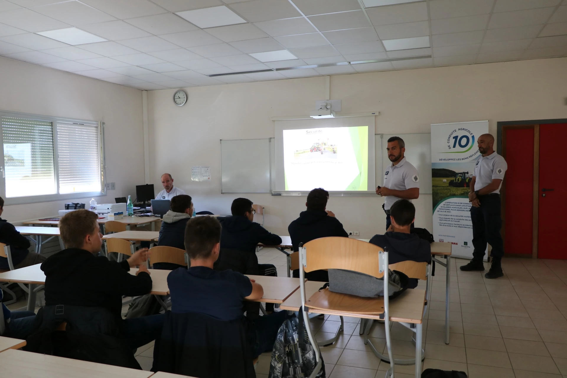 Près de 40 établissements scolaires sont visités chaque année, une équipe de huit policiers nationaux de la CRS, dédiée à l’opération, sillonne la France à la rencontre des élèves de la filière agricole. Mercredi 21 septembre, ils étaient au lycée agricole de Fontaines pour former et informer les élèves en Bac Pro sur les risques à l’utilisation des engins agricoles. Samuel Bruley, directeur adjoint du lycée agricole, est en charge du suivi de cette formation. Les élèves, divisés en deux groupes, passaient par les deux pôles de formation. Le premier plus théorique se faisait dans une salle de classe avec projection de documents montrant des situations d’accidents régulièrement rencontrées en milieu agricole lors de travaux ou de déplacement avec des tracteurs attelés ou pas, moissonneuse-batteuse et autres engins ; une sensibilisation aussi au Code de la route pour circuler avec tout ce très gros matériel roulant.