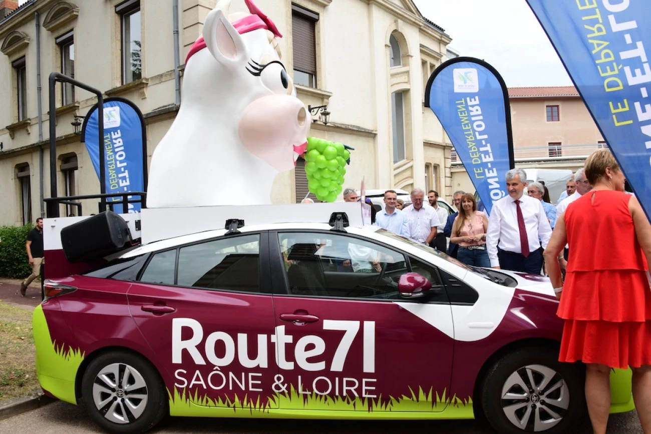 La Saône-et-Loire fera sa promotion avec cinq véhicules. Le premier d'entre eux a été dévoilé jeudi 23 juin. Il s'agit d'une belle et très gracieuse vache puisque le département compte d'ailleurs plus de bovins que d’habitants, notamment de race charolaise.