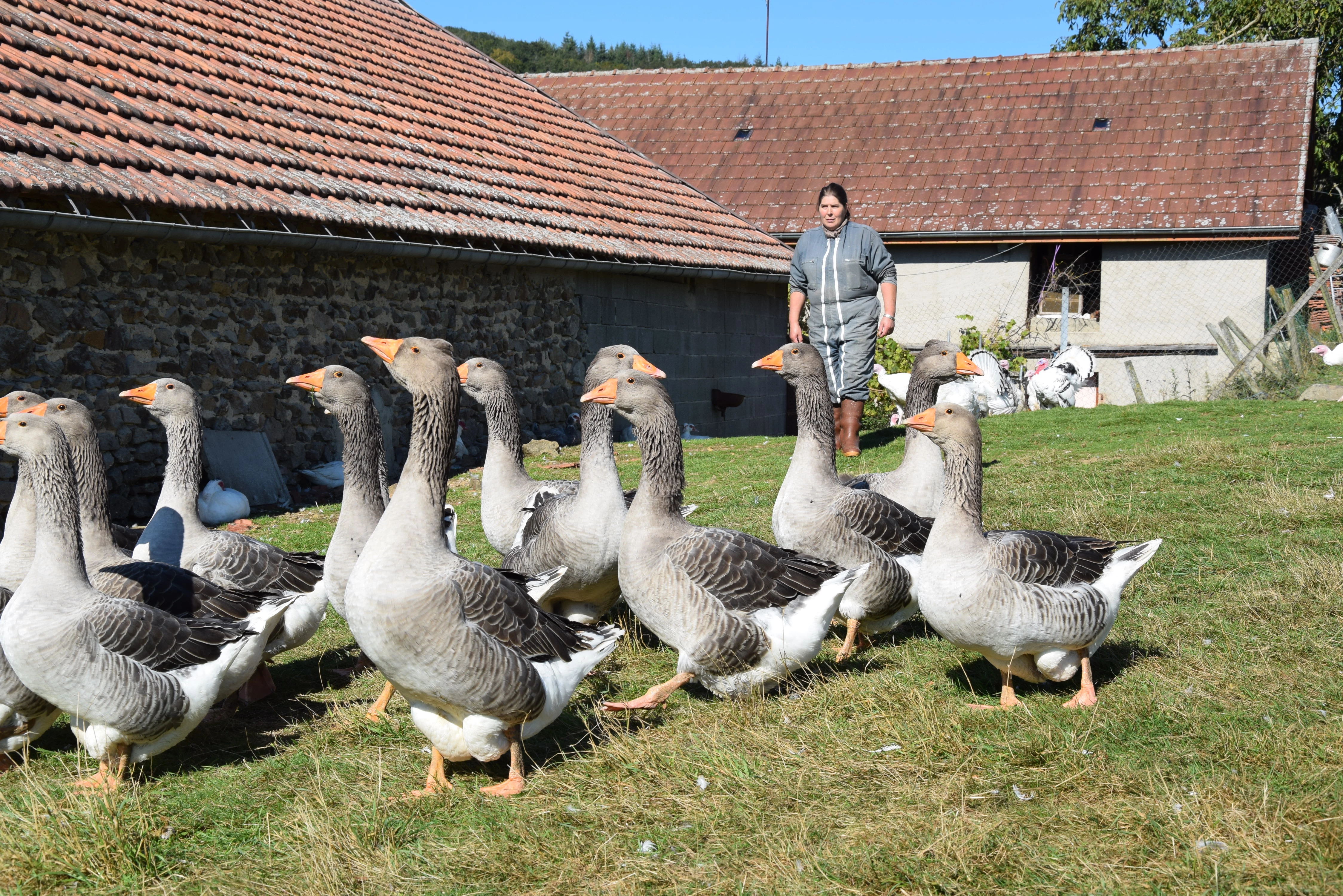 Françoise achète de jeunes volailles démarrées qu’elle élève en plein air, nourries avec des céréales. Les chapons reçoivent un peu de lait pour la finition. Les poulets prennent le temps de grossir pendant près de quatre mois et les pintades sont élevées jusqu’à cinq mois de temps. Quant aux volailles festives, les oies entament leur séjour dès le mois de mai. Chapons et dindes arrivent respectivement en août et en septembre. Françoise vend des oies d’environ 5 kilos. Les dindes atteignent 8 à 10 kg et les chapons près de 5 kg. La centaine de volailles festives qu’elle produit suffit à peine pour satisfaire la clientèle et l’éleveuse connaît une période de travail intense en fin d’année.