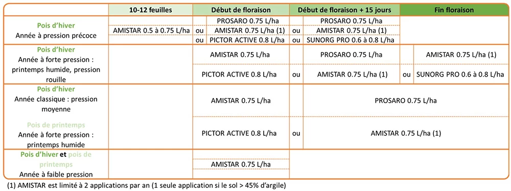 Généralement, le pois d’hiver est plus exposé aux maladies et nécessite donc une protection plus importante que celui de printemps. On compte environ deux-trois passages en fongicides pour le pois d’hiver contre un à deux passages pour le pois de printemps. Le nombre de passages est à adapter à la pression en maladies de l’année et aux conditions météorologiques qui vont favoriser ou non les maladies.