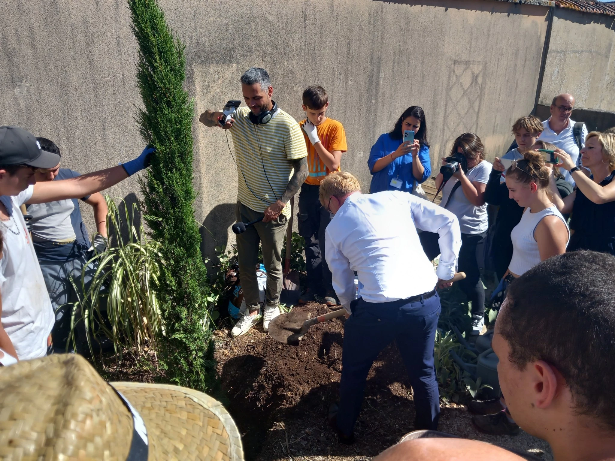 Stéphane Pérennes, directeur de la MFR du Sénonais et par ailleurs maire de Gron, a conduit Marc Fesneau dans une visite guidée montrant les multiples aspects de l’établissement, avant que le ministre ne soit mis à contribution pour planter un cyprès de Provence en donnant la main à des élèves qui se forment au métier de paysagiste. Lors d’un échange avec les élèves, il a été sensibilisé à la difficulté, pour les élèves en bac pro Conduite de productions horticoles (CPH), de trouver des maîtres de stage et d’apprentissage. « Que pouvez-vous faire, lui a demandé Lou, une étudiante en terminale de bac pro CPH, pour revaloriser l’horticulture auprès des jeunes ? » Le ministre partageait le constat de la jeune femme sur la baisse de l’intérêt pour ces métiers, dans un pays qui a pourtant un vrai savoir-faire dans le domaine : « La nécessité de végétaliser nos villes, de replanter des haies à la campagne, va faire qu’on aura de vrais besoins en pépiniéristes, en horticulture. On va devoir produire des plantes. Je ne suis pas inquiet pour l’avenir, l’important, c’est d’organiser les choses, notamment pour que les apprentis trouvent des maîtres de stage. Il faut qu’on arrive à travailler avec les collectivités locales afin d’avoir une vision claire des besoins en végétalisation qui vont s’exprimer et plus globalement, pour revaloriser les métiers agricoles, nous devons insister sur les nouvelles fonctions de l’agriculture ».