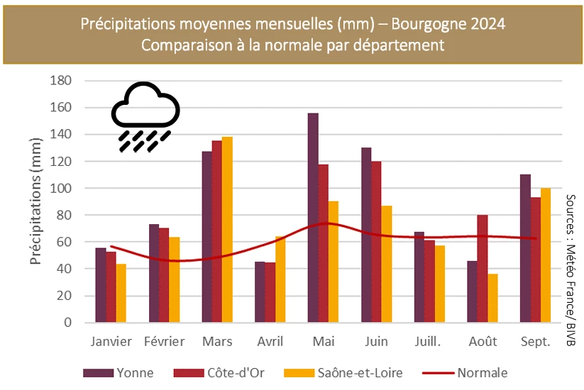 La Bourgogne a été particulièrement arrosée cette année. Elle a subi des précipitations records avec des augmentations de + 42 % en Côte-d’Or et même de + 46 % dans l’Yonne, par rapport aux moyennes. Avec des températures élevées, le gradient Nord Sud se retrouve également du côté des importantes attaques de mildiou sur feuilles et sur grappes de vignes. Les pertes de récoltes ont été particulièrement importantes dans le Chablisien, le Châtillonais et même en Côte de Nuits et de Beaune, excepté pour ses blancs qui ont mieux résisté. La Saône-et-Loire s’en sort miraculeusement bien. Le vent du nord et les jours ensoleillés et secs ont permis à la Bourgogne de néanmoins produire partout « des vins savoureux », rassurait François Labet, le président délégué du BIVB. Il remerciait tous les salariés et vignerons qui n’ont pas ménagé leurs peines, y compris les weekends. Car, il ne fallait rater aucun passage ou mal faire son traitement cette année qui ne pardonnait rien. Dans ce contexte difficile, le domaine des Hospices de Beaune, dirigé par sa régisseuse, Ludivine Griveau, a néanmoins réussi à finaliser sa conversion en agriculture biologique. Un exploit salué.