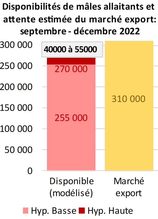 D’après Idele, en s’appuyant sur les données de cheptels et les outils de modélisations de la destination des mâles (basées sur l’historique), les sorties de mâles allaitants entre septembre et décembre, destinées à l’export, étaient estimées entre 255.000 et 270.000 têtes. Ces deux bornes sont liées à deux tendances : la borne basse correspond à des mises en place « dynamiques » en France pour la production de jeunes bovins (tendance de 2021) ; tandis que la borne haute correspond à une orientation plus favorable vers l’export au détriment de l’engraissement en France (tendance de 2019).