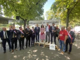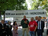 Plusieurs dizaines d’agriculteurs venus de la région parisienne et des régions d’élevage se sont rassemblées, de manière pacifique et conviviale, en fin de matinée, le 9 juillet sur la place de la Reine Astrid dans le 16e arrondissement de Paris, à quelques encablures de l’ambassade du Brésil, à l’appel de la FNB. C’est de manière tout aussi symbolique que les organisateurs ont fait venir deux vaches charolaises de la Nièvre qui ont pu profiter du cadre ombragé de cette place parisienne. De nombreux orateurs se sont succédé à la tribune improvisée par quelques palettes derrière laquelle un calicot affichait un cinglant et explicité « Non aux accords UE / Mercosur » (cf. photos).