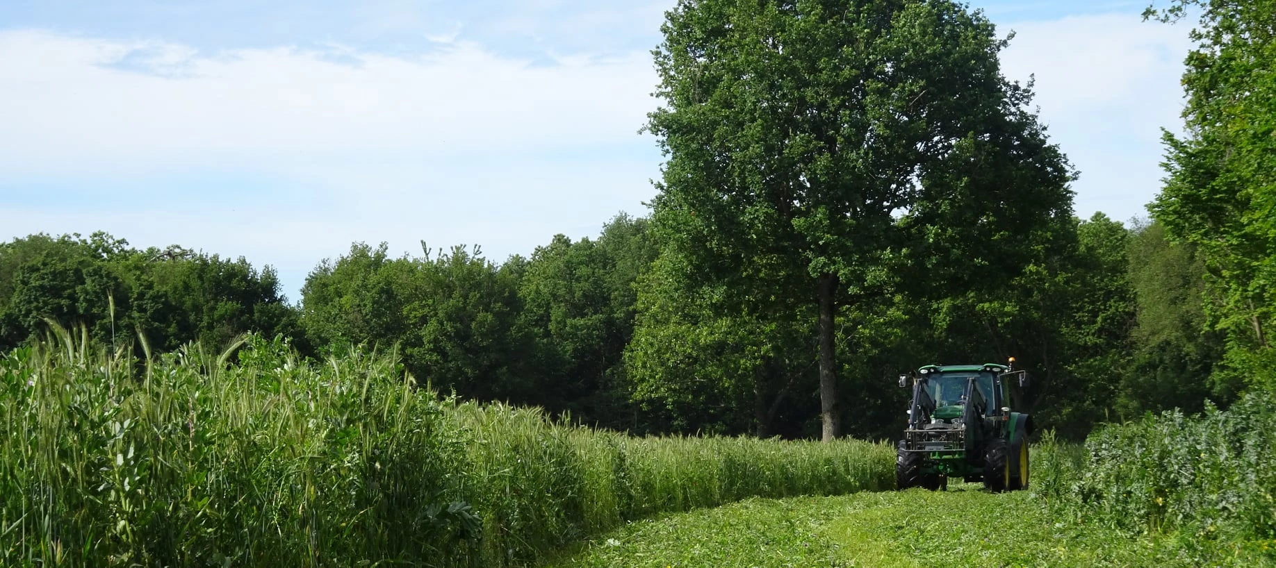 Légende : Une fois les méteils associant céréales et protéagineux récoltés en ensilage, la prairie est déjà bien implantée et prête à pousser sur la fin de printemps.