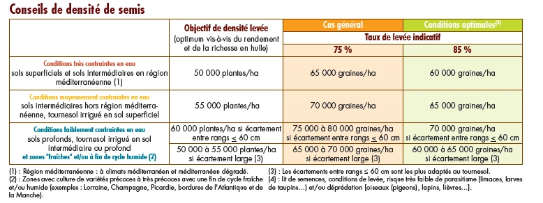 La densité optimale de semis dépend des contraintes hydriques, du type de parcelle, de l’écartement entre rangs et du climat régional, notamment en zone fraîche ou humide en fin de cycle. En moyenne, elle se situe entre 65 000 et 70 000 graines/ha pour optimiser le rendement et la teneur en huile. Avec un écartement supérieur à 60 cm, il faut éviter les surdensités sur la ligne pour limiter la concurrence entre pieds. Un écartement de 40 à 60 cm est préférable, permettant un gain de 1 à 4 q/ha par rapport à un semis large type maïs (75-80 cm).
